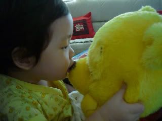 And, they loves to imitate. Like now, I have to brush my teeth infront of B.Bee so that he will open his mouth willingly to let me brush his. B.Bee imitates how Granny exercise; how I push the table; how Daddy pushes out his dentures, B.Bee doesn't have one so he sticks out his tongue[LOL]; imitating some advertisements, so on and so forth.